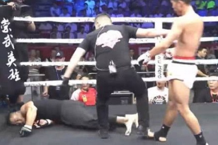 随后,上场的是欢呼声极高的咏春拳实战高手丁浩,年龄27岁,身高180cm,体重78公斤,是咏春拳的实战派代表,相比太极教练宋德财,丁浩的实力似乎更强。比赛开始,选手丁浩采取主动出击,充分发挥咏春拳的技术,曾一度将散打小伙脸上打出个口子,可大概1分钟后阿虎熟悉对方的套路,反客为主,一记精准的高鞭清晰的打中丁浩头部,完成真正意义上的爆头KO,丁浩当场倒地昏迷不醒,时间便定格在74秒。