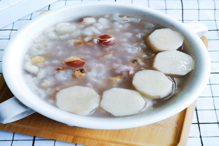 芡实山药粥准备的食材就是芡实、薏米、山药、大米等四种。做法:将这几种米分别洗干净放入水中浸泡,把山药去皮后切成小段备用。把泡好的芡实、薏米、大米等放入锅中,加适量的水煮开,倒入山药后煮到熟烂,加适量白砂糖调味后既可服用。此粥同样具有非常好的健脾除湿效果,非常适合脾虚湿盛、腹泻的患者服用。
