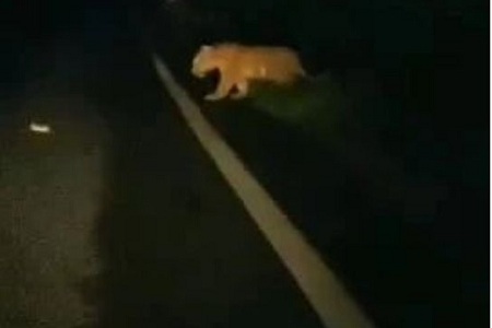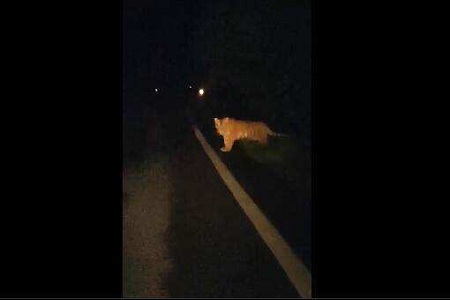 最近吉林省珲春市马滴达乡,一辆出租车经过省道201时候,居然遇到东北虎了。当时,只见一只东北虎横穿马路,而在看到车子后,它便和的士车内的司机对视了一会,然后消失在夜空中。