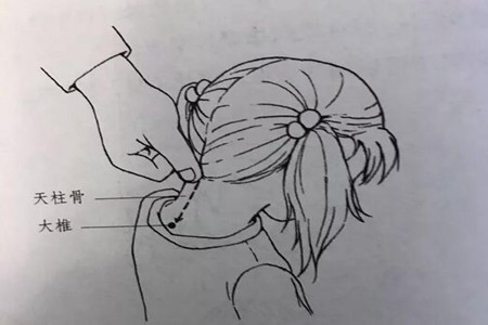 天柱骨的位置在背后从发际线开始到大椎穴的一条直线上,大椎穴就在咱们平时低头脖子后头最突出的那根骨头下面的凹陷处。