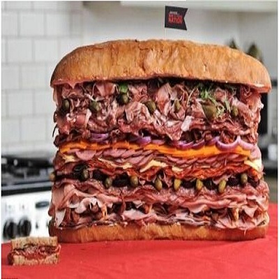 2、三明治 说到三明治可以说很多家庭都会做,当做早餐食用。一份三明治一杯牛奶,早餐吃的又饱又有营养。但是你们知道最大的披萨有多大吗。25斤是的你没听错25斤的三明治,真是不敢想象。这样应该属于我们一家一个星期的早餐了。
