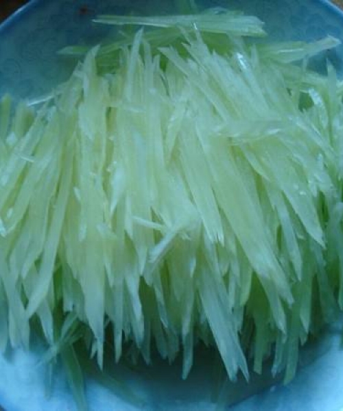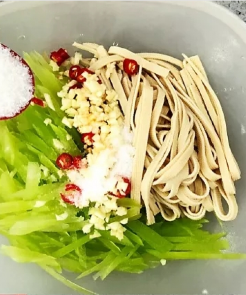材料:莴笋、豆腐皮、小米椒、大蒜、食盐、生抽、白糖、香油。