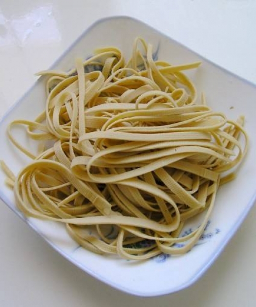 2、炒锅中煮开热水放入豆腐皮捞出后切丝;