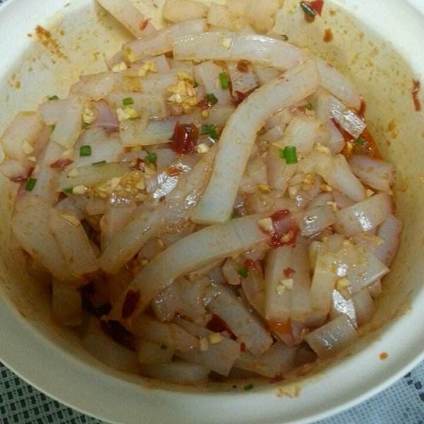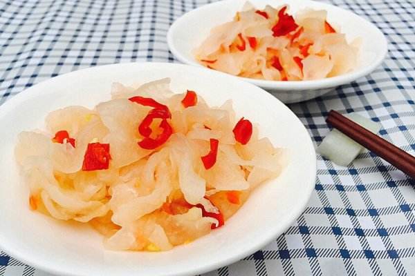 5、捞出放入凉白开里冷却,冷却后稍沥水份,装入较大的盆中,调入盐、白醋、白糖,拌匀腌制入味。
