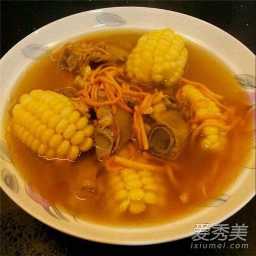 材料:排骨500克,玉米1根,虫草花15克,盐适量,姜适量,枸杞适量。