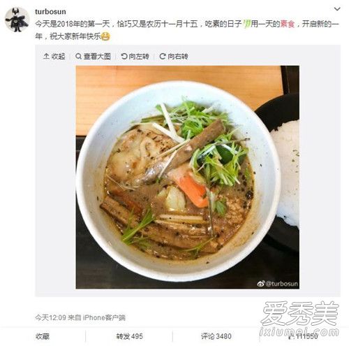 新年第一天,很多人都在晒跨年、晒游玩、晒照片,于是孙俪晒吃素成了网上的一股清流。今日中午孙俪发微博称:今天是2018年的第一天,恰巧又是农历十一月十五,吃素的日子,用一天的素食,开启新的一年,祝大家新年快乐。