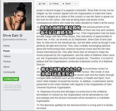 当地时间1日,缅甸万国小姐赛事主办方Hello Madam Media Group(HMM)称,Shwe Eain Si的言论无法担当一个模范。HMM在声明中称:是的,Shwe Eain Si制作了一段关于在若开邦武装分子传播恐怖统治的视频,这对她成为一名选美小姐的形象有害。作为缅甸公民,她应该利用自己的名望去说出这个国家发生的真相。