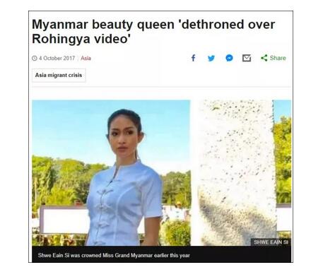近期万国选美大赛冠军缅甸小姐Shwe Eain Si,上周在脸书发布一段视频,以流利的英语批评武装组织罗兴亚救世军(ARSA)引发若开邦的暴力冲突。而后万国选美大赛官方剥夺了Shwe Eain Si冠军头衔。 在国际上造成了不小的舆论风波。