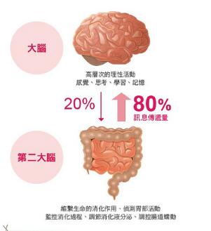 西方医学界近年来透过不断研究,渐渐发现肠道在全身运作中所占的地位,不仅仅只是消化吸收,还透过神经系统影响身体其他部位的运作。 依附在肠道周边的神经细胞,据统计大约一亿个,居然与脊髓神经细胞的数量不相上下。 这么多神经细胞要做什么? 研究发现大脑与肠道神经之间讯号传递量中,从大脑传到肠道仅有20%,其余80%都是从肠道传送讯息到大脑,可见肠道对大脑的影响程度远大于大脑对肠道的影响。