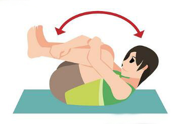 抱着膝盖仰躺,使用腰部前后活动,背部尽量不要弯曲,可以透过此动作刺激连着骨盆的脊椎,让歪斜的脊椎变回直的状态。