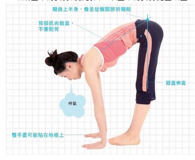 一边吐气,不要弯腰驼背,慢慢地使上半身往前弯,像是从髋关节折弯般,双手则贴在地板上,保持姿势5秒钟。