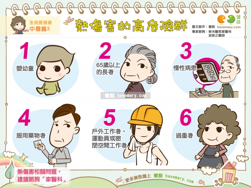 老、弱、幼以及经常曝晒者都是热伤害的高危险群,建议家有婴幼童、65岁以上长者、慢性病患、服用药物者、体重过重者都应随时提高警觉,留意环境温度是否合宜,避免久处于高温环境。