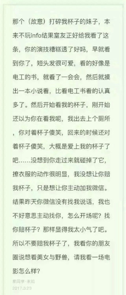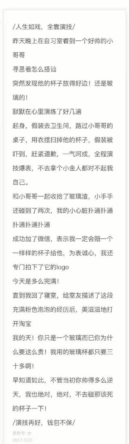 男主角室友也上线了...你不是一个没有故事的男同学!一不小心被喂了一顿狗粮!感觉像看了一部《三生三世十里玻璃杯》至于男女主角后来是如何发展的,目前还不得而知...