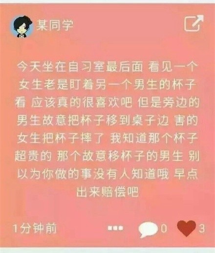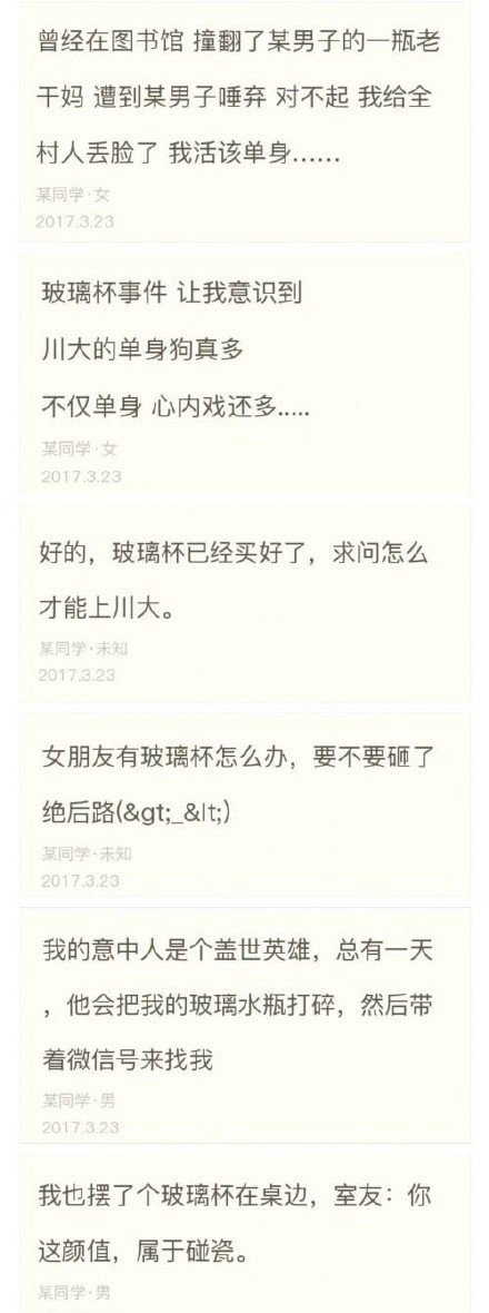 事情起因源于四川大学的信息共享平台上面的一条帖子,一场由玻璃杯引发的爱恨情仇就这样发生了...