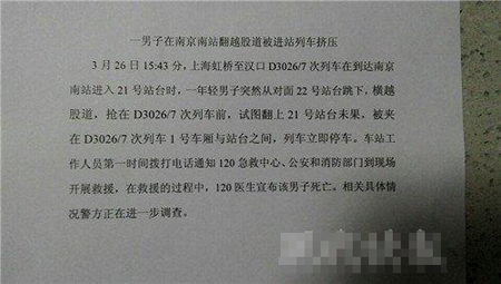 南京火车站、京沪高铁南京南站官方微博回应称,3月26日15:43分,上海虹桥至汉口D3026/7次列车在到达南京南站进入21号站台时,一年轻男子突然从对面22号站台跳下,横越股道,抢在D3026/7次列车前,试图翻上21号站台未果,被夹在D3026/7次列车1号车厢与站台之间,列车立即停车。车站工作人员第一时间拨打电话通知120急救中心、公安和消防部门到现场开展救援,在救援的过程中,120医生宣布该男子死亡。