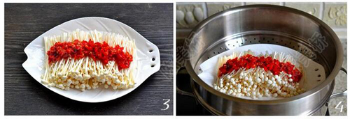 3、金针菇中间均匀铺一层剁辣椒。