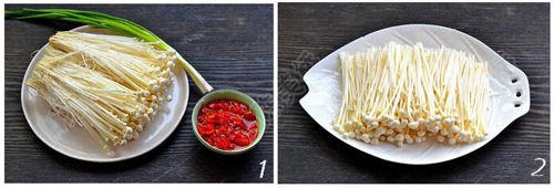 金针菇切掉根部后,有些地方还粘在一起,可以用手轻轻搓一搓,自然就散开了。金针菇一定要充分蒸熟才能食用,以免损害肠胃。蒸好的金针菇水特别多,要先倒掉,再放调料。淋佐料的油一定要热。