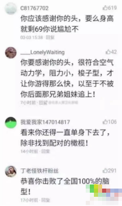 近日,网上热传一篇文章《男子上传自拍照 获得网友无限追捧所有评论都亮了》。文章中一男子因照片中的头型较有特点,而被网友调侃为橄榄球枣核成精顺产时用了产钳午夜丑时生等。