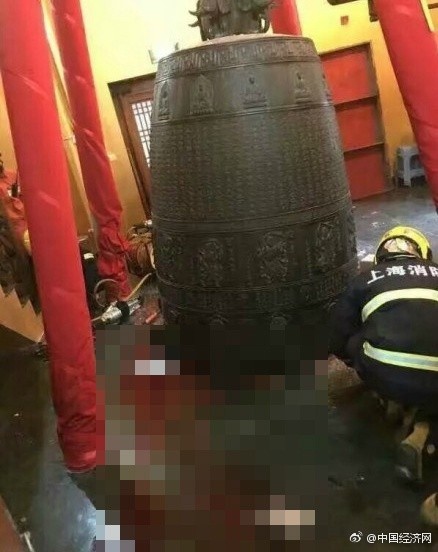 昨日(5日)23时53分,一位名叫JowYoKee的网友发布微博并配图称,当晚看到静安寺的钟掉下。其发布的图片显示,一口大钟立在地上,钟口沿边的地上有血迹。一张聊天截图中提到,人被困在钟罩里,脚被砸断。