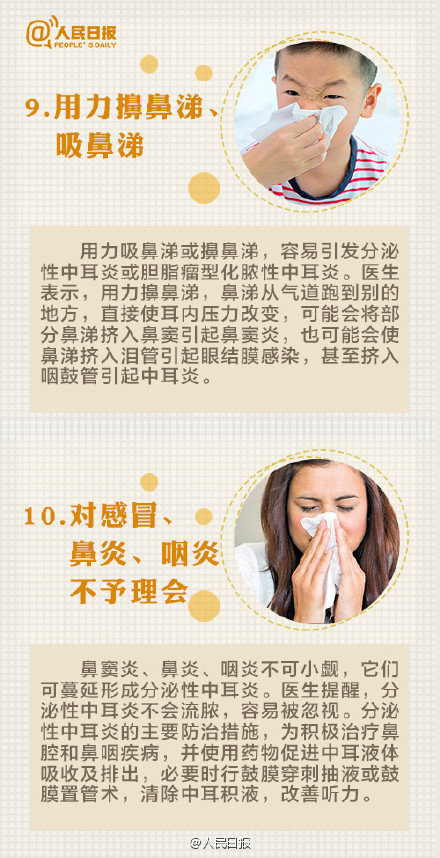 耳朵是我们感知外界的一扇窗,可你知道吗?你的一些不经意的小习惯很伤耳!经常在地铁里听歌、长时间接打手机、用力擤鼻涕、经常泡吧或去KTV…都会损伤你的听力!今天,第18个全国爱耳日。关爱耳朵,从远离伤耳的10个习惯开始!