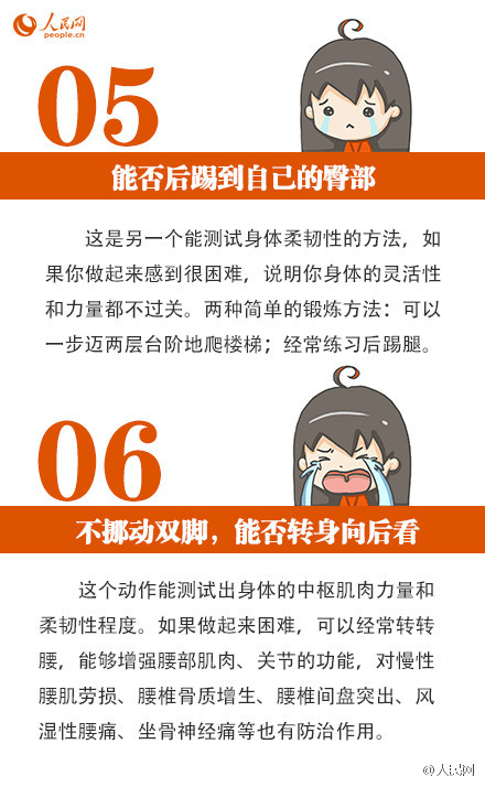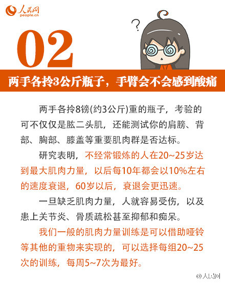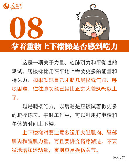 如果能做这10个动作,说明你很!早上7点起床,9点就会无精打采?拿着重物上下楼梯是否感到吃力?连续走30分钟是否感到疲累?......我们身体的好坏可以通过体检知道,也可以从我们身体其他方面看出,赶快看看吧!ps:小编测了测,全都没问题,你呢?