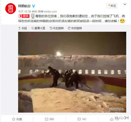 祥鹏航空挖错飞机:飞机被雪埋了 我们挖错了