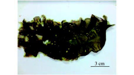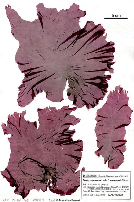 脐形紫菜(P. umbilicalis)的标本,因保存得当,还能清楚地分辨它的紫红色。展开就是这样
