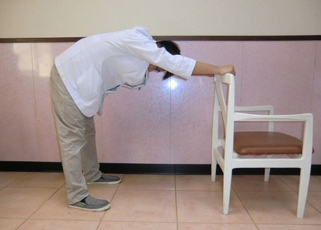 双脚打开与肩同宽,双臂打直往前伸展,若有椅子则将双手置于椅背上,若无椅子则想象前方有人拉着自己的双手缓慢向前延伸,背部需略有紧绷感,静止10-15秒,回复,重复10次。这个动作可以伸展背部及腰部的肌群。