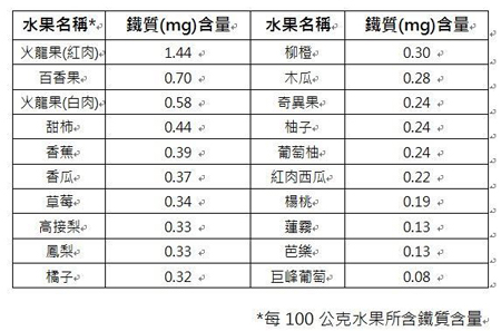 营养师指出,每100公克红肉火龙果含有铁质1.44mg,根据最新DRIs指出19~50岁每日铁质建议摄取量男性为10mg、女性为15mg,51岁以上每日铁质建议摄取量男性与女性相同为10mg。