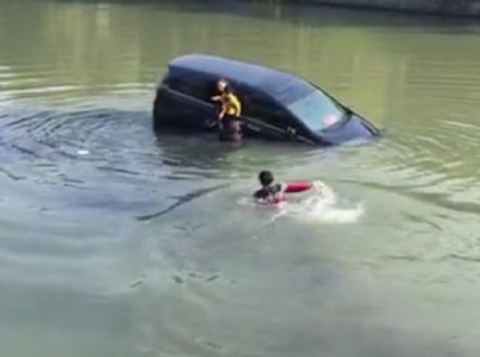 中午11点10分左右,55岁的郭刚听到嘭一声巨响,刚开始,他以为是洗车的门洞被撞破了,冲下去一看,没事,再往外看了下,一辆车飞到了河中央。当时车子一半在河里,一半在河面上,倾斜着,正慢慢往下沉。 郭刚说,车子冲入河中力道应该挺大,岸边近40厘米高的水泥防护栏和铁管都被撞坏了。有个小伙子已经跳下了河,正往车子那游去,车子离岸边近20米。车里的人大喊救命,孩子吓得大哭,情况紧急又揪心。