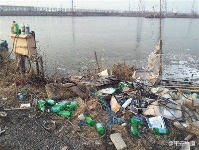 11月底,天津塘沽周围的过百鱼塘有些荒芜,堤岸上丢弃的空药瓶已经发黄。陈明的鱼塘从鱼苗放进去那一刻,就要撒药,中间还要投放消毒药、抗生素,隔两个月还得增加改善水质的药。一年七八次的鱼药使用,一次就得撒下去30多箱。
