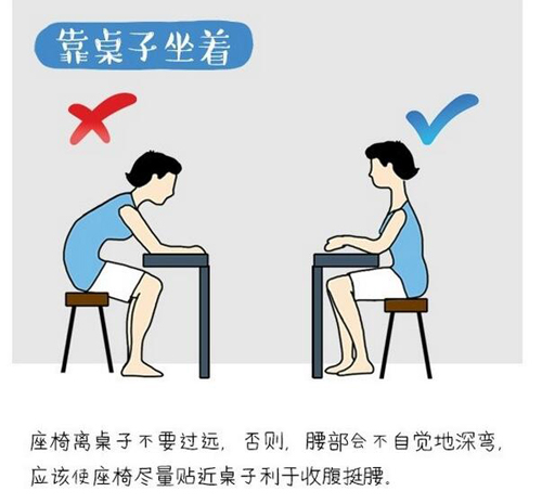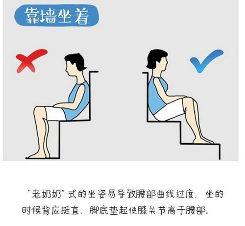 坐下来靠着桌子的时候,椅子离桌子不要太远,否则腰部会不自觉地深弯。 靠墙时,「老奶奶式」坐姿易导致腰部曲线过度,建议最好是背挺直、脚底垫起使膝关节高于腰部。