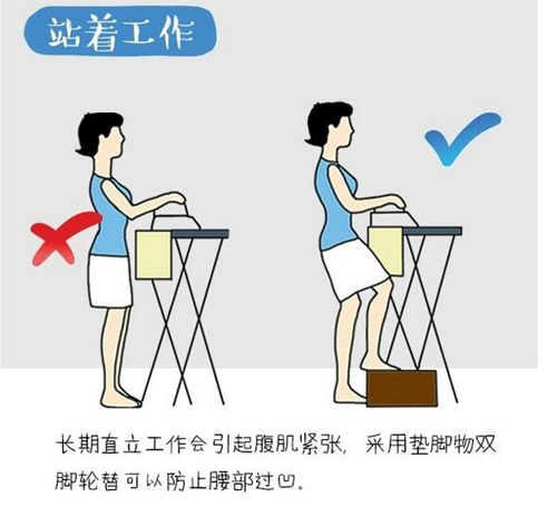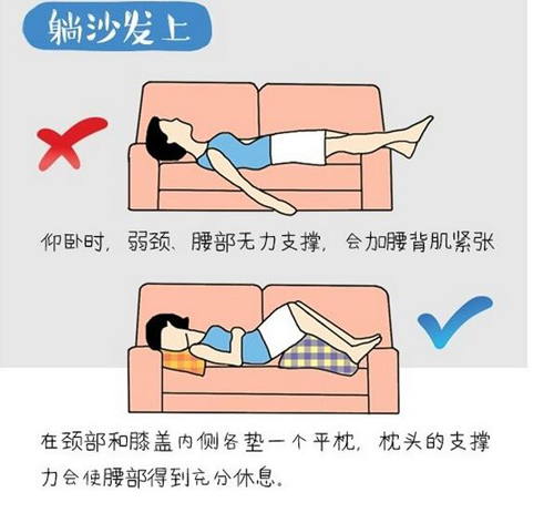 而躺在沙发上,如果颈部及腰部没有支撑,会增加腰背肌紧张,最好是在颈部、膝盖内侧各垫一个平枕,透过枕头的支撑让腰部得到休息。 另外,长期站着工作,会引起腹部紧张,应该用垫脚物,双脚轮替,防止腰部过凹。