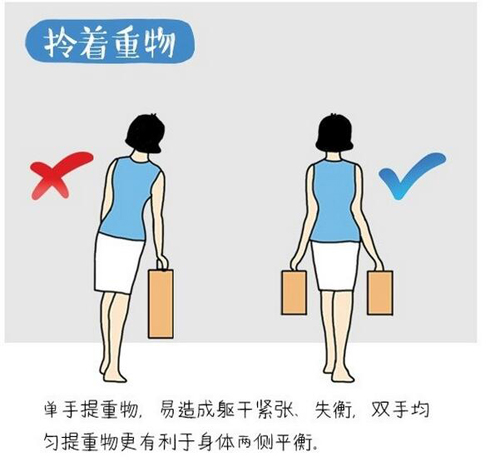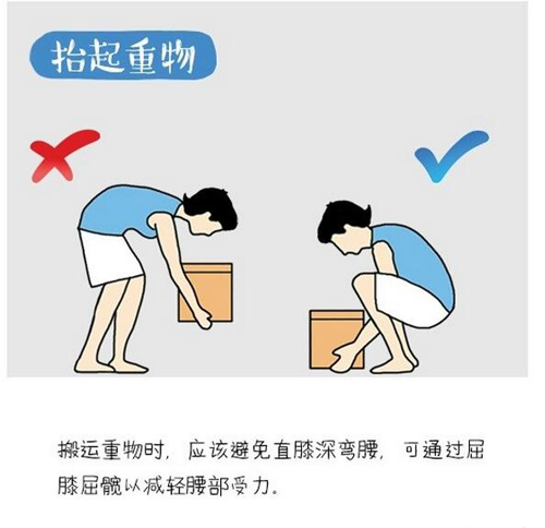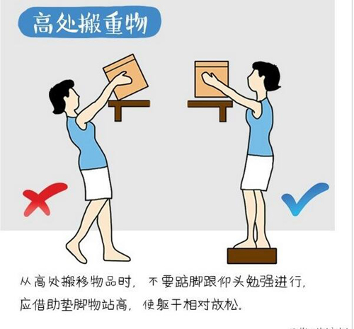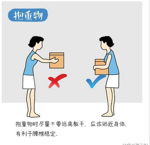 人在抬起重物时,应该避免直膝深弯腰,可以透过屈膝屈髋减轻腰部受力,而抱重物时,重物最好贴近身体,这样有利于腰椎稳定。 从高处搬重物,则尽量不要踮脚、仰头勉强进行,应该借助垫脚物站高,让躯干相对放松。 另外,单手拿重物容易让身体失衡,最好是双手均匀提重物。