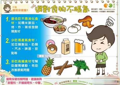 此外,若有胀气问题者建议可多吃高纤食材,如菠萝、牛蒡、地瓜叶、酪梨等蔬食,帮助肠胃蠕动、改善胀气问题。肠胃保健相关问题,建议咨询家医科、肝胆肠胃科、中医。