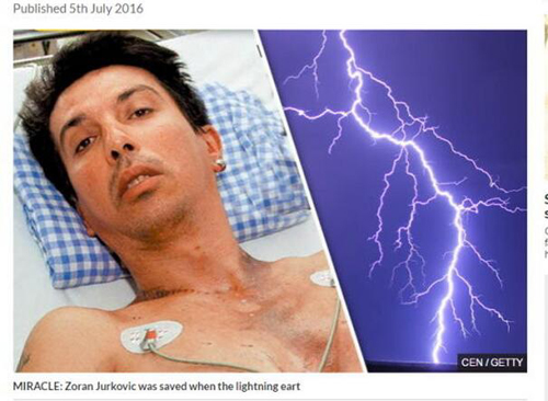 原以为闪电直接打在尤尔科维奇身上,他应该是一命呜呼了,没想到奇迹竟然发生在他的身上,电流绕过了他的心脏,从他的阴茎导出电流。
