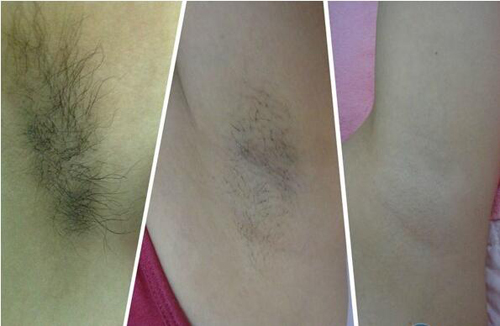 一名腋下毛发旺盛的女性,试过各种方法,蜜蜡、除毛膏、刮胡刀、甚至用拔除的方式,总是没有很好的效果,后来终于求助皮肤科医师。采用无痛冷光除毛,过程不痛又能一劳永逸,达到永久除毛。
