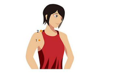 按摩锁骨和腋下之间的云门穴(1),以及肩膀正上方的肩井穴(2),可使胸前、脖颈与肩膀的血液循环顺畅,疏通淋巴阻塞,提升新陈代谢。 养成习惯持续进行,可让造成暗沉斑点的黑色素排出,让脸色恢复明亮健康好气色。
