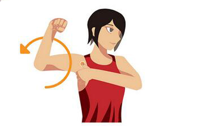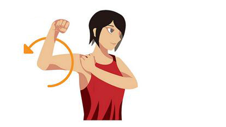 STEP4.一边从嘴巴吐气,一边以左手固定肩膀,将手腕抬起往后转。 来回重复3~4三回。