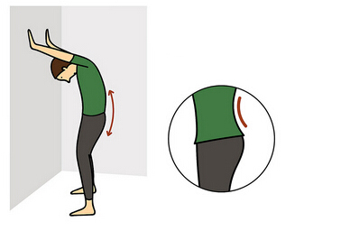 面向墙壁,双脚打开到与肩膀同宽,两手扶着墙。 吸气5秒钟,吐气的同时将背拱成圆形。