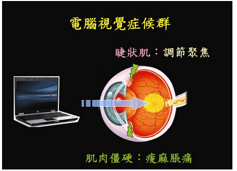 20世纪计算机与电视的发明,造成了所谓「计算机视觉症候群」,这是指计算机与电视长时间使用,造成眼部睫状肌的僵硬。 睫状肌是眼睛内调节聚焦的主要肌肉,肌肉僵硬,自然会造成眼睛「酸麻胀痛」的症状。