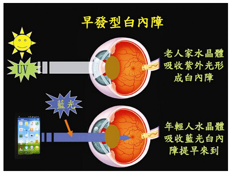 3. 光线进入眼睛后,其能量较高的蓝光可由水晶体加以吸收,但日久就会造成蛋白质变性,使得水晶体变得混浊。 年纪轻轻就有的白内障,就称为「早发型白内障」,这时病患会觉得影像变暗视力模糊,而日久水晶体严重水肿,聚光力增强,将使近视度度数增加,这种近视就不是「假性近视」了。