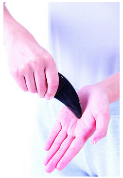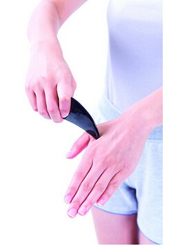 3. 以刮痧板的鱼尾圆角在劳宫穴点按1分钟或以拇指按摩1分钟。