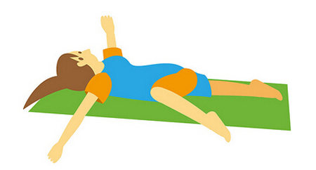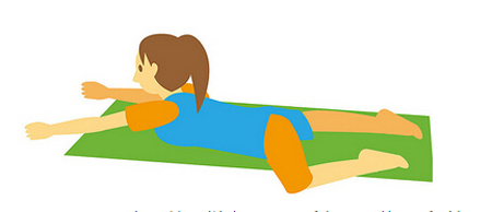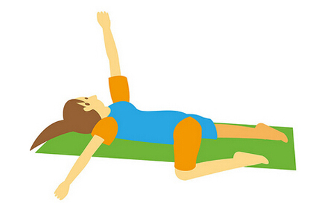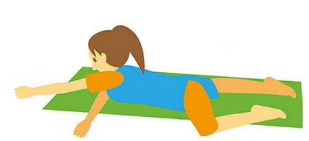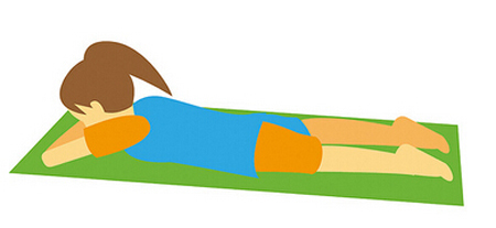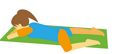 动作1:趴下来,双臂交叠,下巴靠在双臂上,慢慢地以腹式呼吸法呼吸(吸气时腹部膨胀,吐气时腹部凹陷),持续30秒~1分钟,放松,想像自己将一天的疲劳、身体的紧张感统统排出体外。