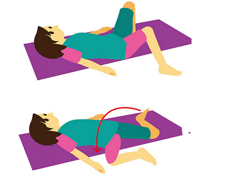 2.双脚膝盖同时往右侧倒下,扭转腰部,尽量使膝盖碰触到地板,并维持2~3秒。
