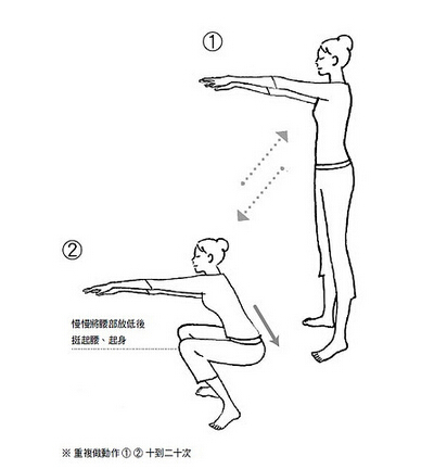 接着是蹲下。 ①双手往前平举,②双膝慢慢弯曲,再慢慢伸直,然后站起来。 膝盖弯曲,然后伸直。