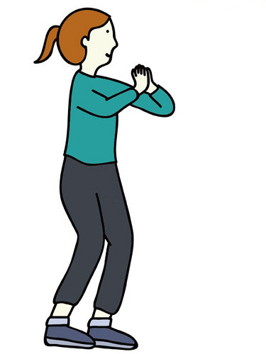 ❷ 两手从胸前往身体两侧甩,进行扩胸运动,其频率也要与心跳数配合。