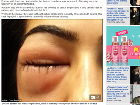 事后医院替该女子进行检查,她患有眼眶气肿(orbit emphysema),擤鼻涕或是打喷嚏后,眼球突出的情况明显加重,眼睑明显肿胀;一旦眼眶内压突然急遽升高,最严重的情况恐会造成失明。