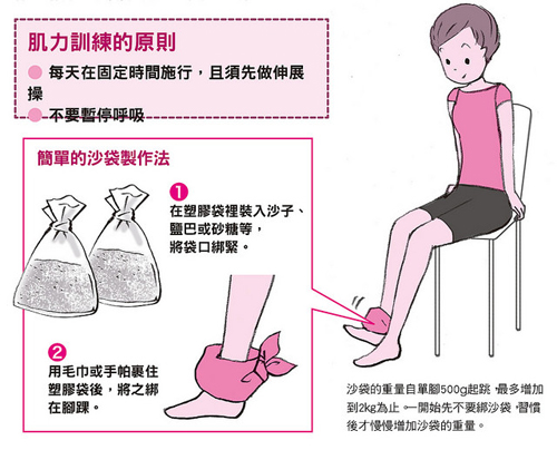 不过,若用了不正确的训练方式,反而有可能会导致膝痛恶化。 应详细阅读本书的说明文后再施行肌力训练,只要采取正确的训练方式,就绝对不会有膝痛加剧的问题。 等到肌力增强后,也可以酌量绑上沙袋,提升肌肉强化的成效。