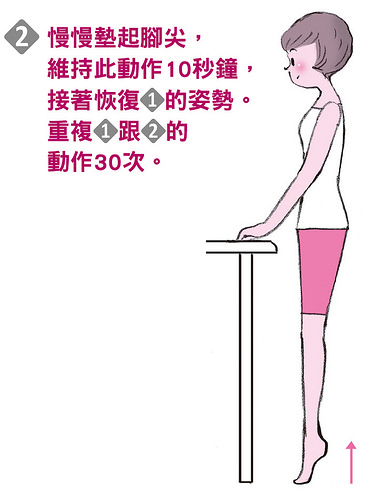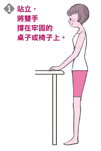 能锻炼小腿肚及小腿的肌肉。 由于有摔倒的危险,因此双手一定要撑着桌子等物。